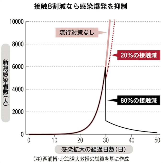 新型コロナウイルスの感染者が都市部を中心に急増するなか、「早急に欧米に近い外出制限をしなければ、爆発的な感染者の急増(オーバーシュート)を防げない」との試算を北海道大学の西浦博教授がまとめた。東京都では感染経路不明の患者が急増しており、現状のままでは1日数千人の感染者が出るとした。人の接触を8割減にできれば減少に転じるとしている。
