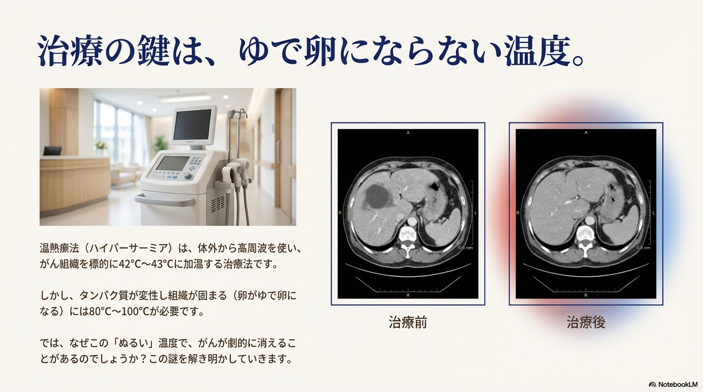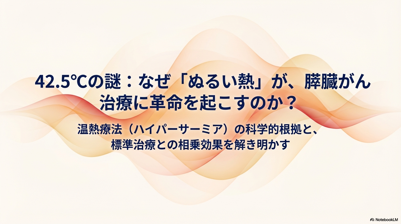 本ブリーフィングは、京都先端科学大学の小倉理教授(日本ハイパーサーミア学会理事長)による講演に基づき、がん治療法であるハイパーサーミア(温熱療法)の作用機序、臨床的有効性、特に膵臓がん治療における重要性をまとめたものである。ハイパーサーミアは、高周波を用いてがん組織を選択的に42.5℃以上に加温する治療法であり、その有効性は5つの主要な生物学的メカニズムに支えられている。