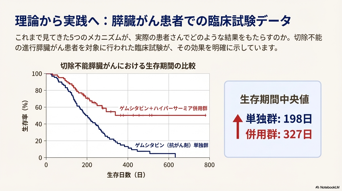 切除不能膵臓がん患者を対象とした臨床試験において、化学療法(ゲムシタビン)単独群とハイパーサーミア併用群を比較した結果、生存期間に有意な差が見られた。