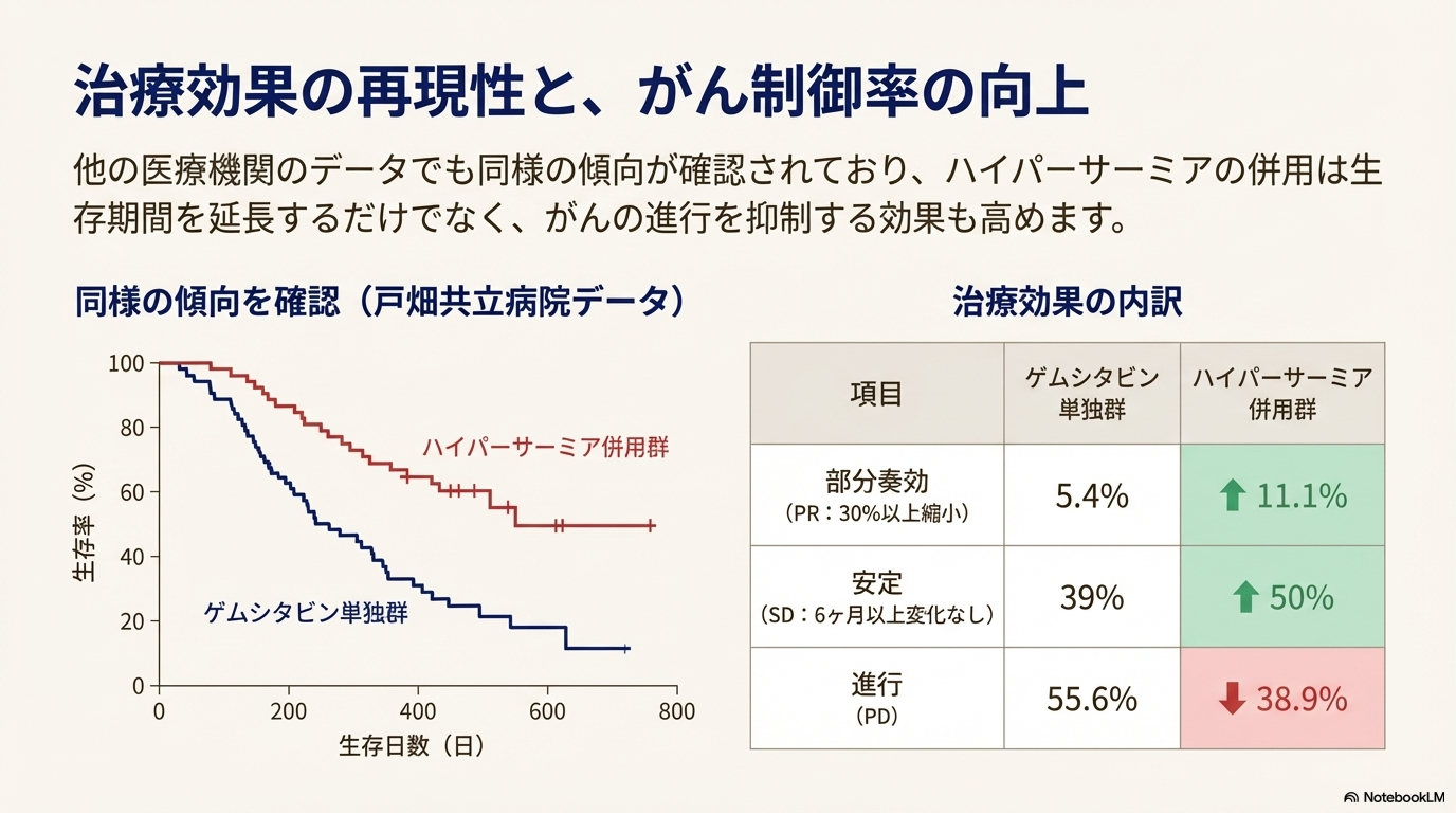 ハイパーサーミア併用群では、腫瘍が縮小または安定する割合が高く、進行する割合が低いことが示されている。