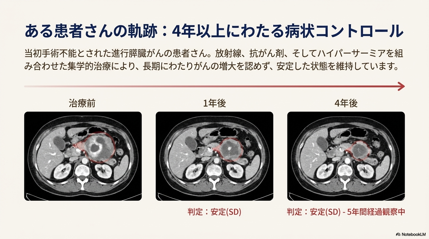 - 症例1: 進行膵臓がんで手術不能だったが、放射線、抗がん剤、ハイパーサーミアを併用。4年後も腫瘍の増大は認められず、5年間経過観察中である。