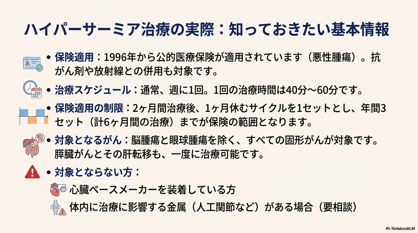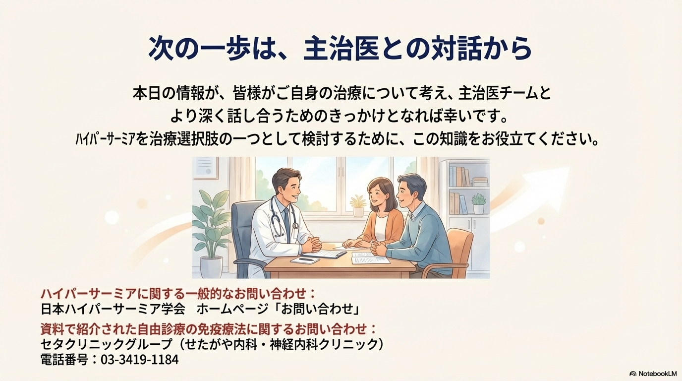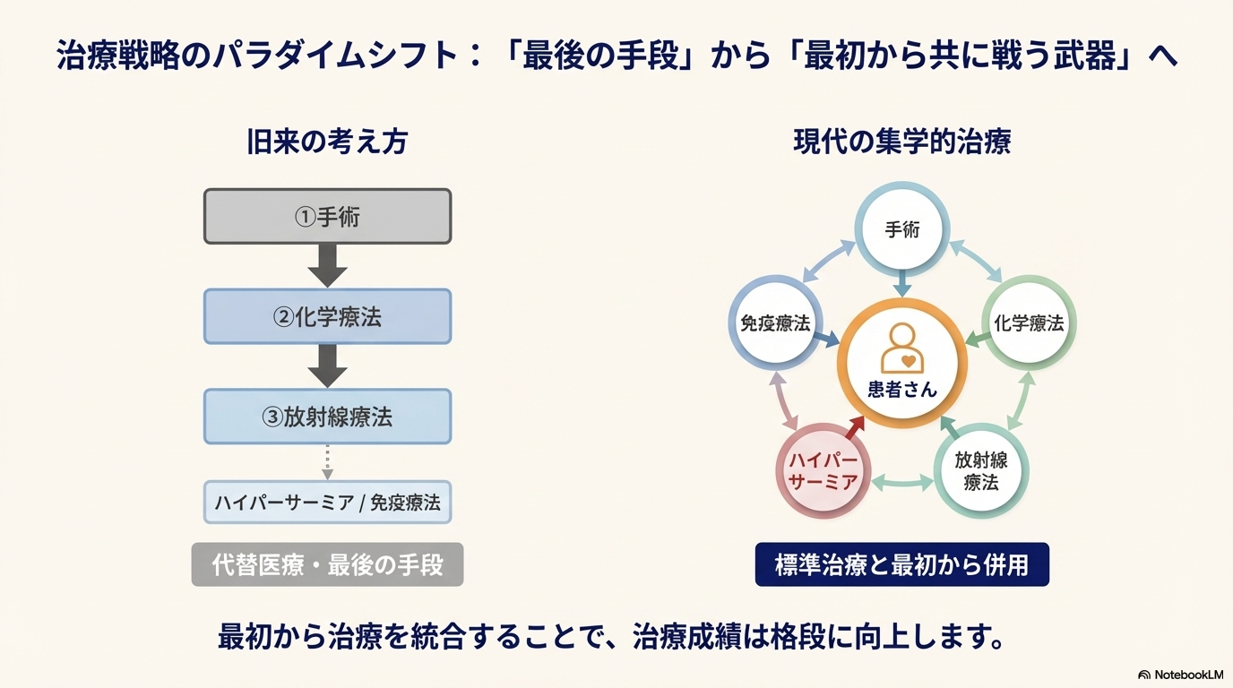 現代のがん治療では、ハイパーサーミアを治療の最終手段とするのではなく、手術、化学療法、放射線療法といった標準治療と初期段階から組み合わせる「集学的治療」が治療成績を向上させる鍵であると結論づけられている。