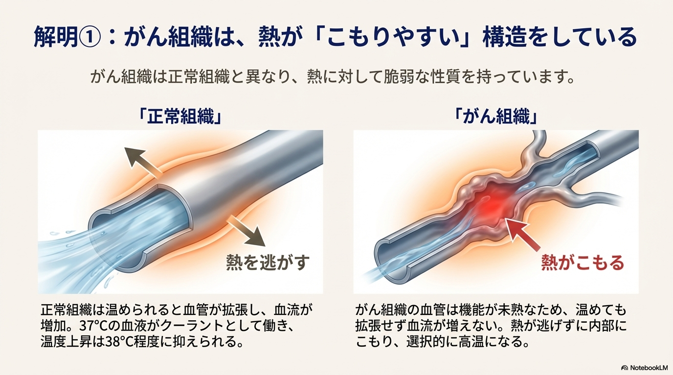 - がん組織: 腫瘍内の血管は急造された脆弱な構造のため、加温されても血管が拡張せず、血流が増加しない。これにより熱が組織内にこもりやすく、選択的に高温状態(42.5℃〜43℃)に達する。