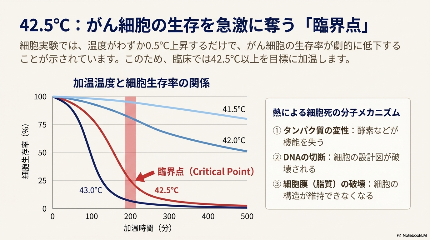 - 細胞レベルでの致死効果: 42.5℃程度の熱でも、がん細胞内の分子に以下のような不可逆的なダメージを与える。