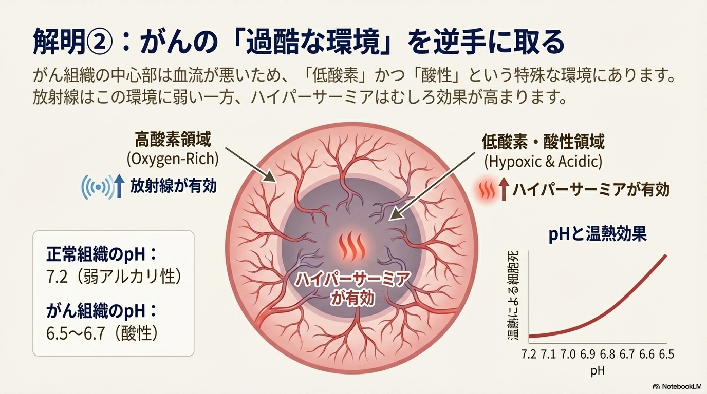 - ハイパーサーミア: 低酸素・酸性領域で効果が高い。