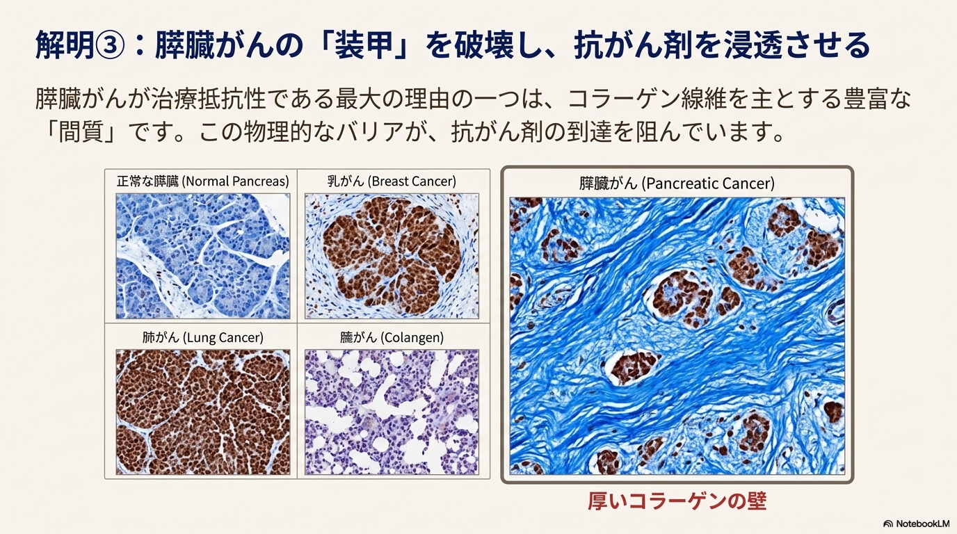 - 間質成分(コラーゲン)による物理的バリア: 膵臓がん組織は、コラーゲン線維を主成分とする間質が異常に豊富である。この密なコラーゲン層が物理的な壁となり、抗がん剤や放射線ががん細胞に到達するのを妨げている。