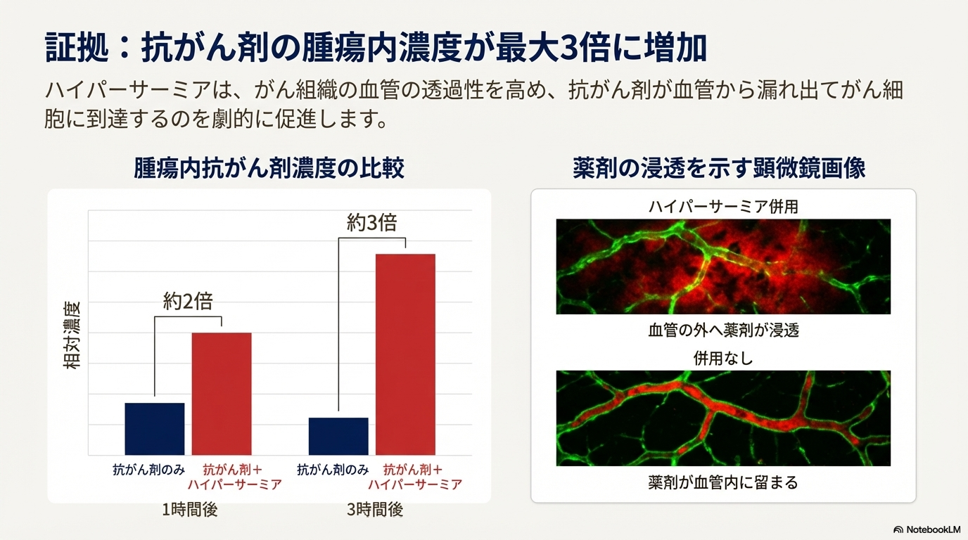 - 薬剤送達の改善: 加温により腫瘍内の血管透過性が亢進し、抗がん剤が血管外へ漏れ出しやすくなる。これにより、がん組織内の薬剤濃度が大幅に上昇し(1時間後で約2倍、3時間後で約3倍)、化学療法の効果を増強する。
