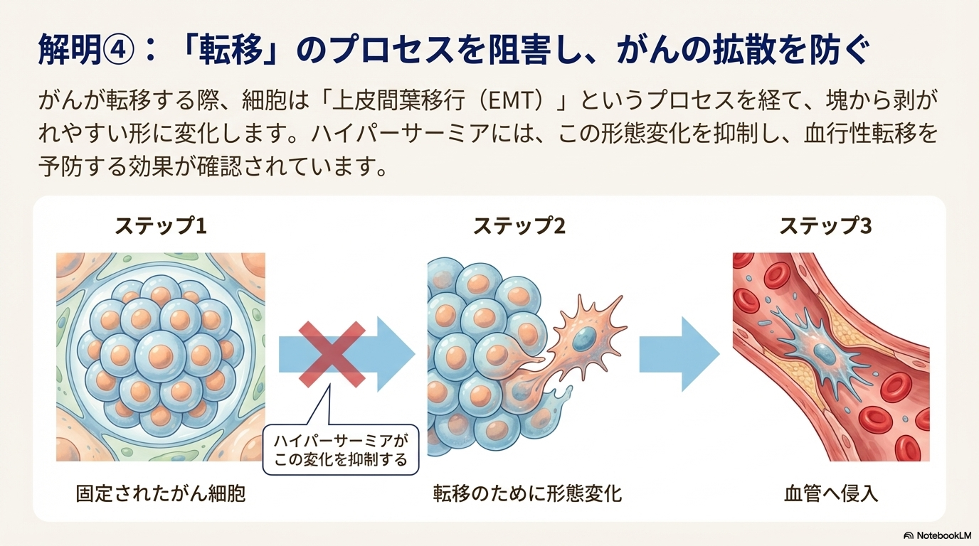 - ハイパーサーミアによるEMT抑制: 実験により、ハイパーサーミアがこのEMTプロセスを抑制し、がん細胞が転移能力を獲得するのを防ぐことが確認されている。特に、抗がん剤(ゲムシタビンなど)が副作用としてEMTを誘導する場合があるが、ハイパーサーミアを併用することでその作用を打ち消し、転移を抑制する効果が期待できる。