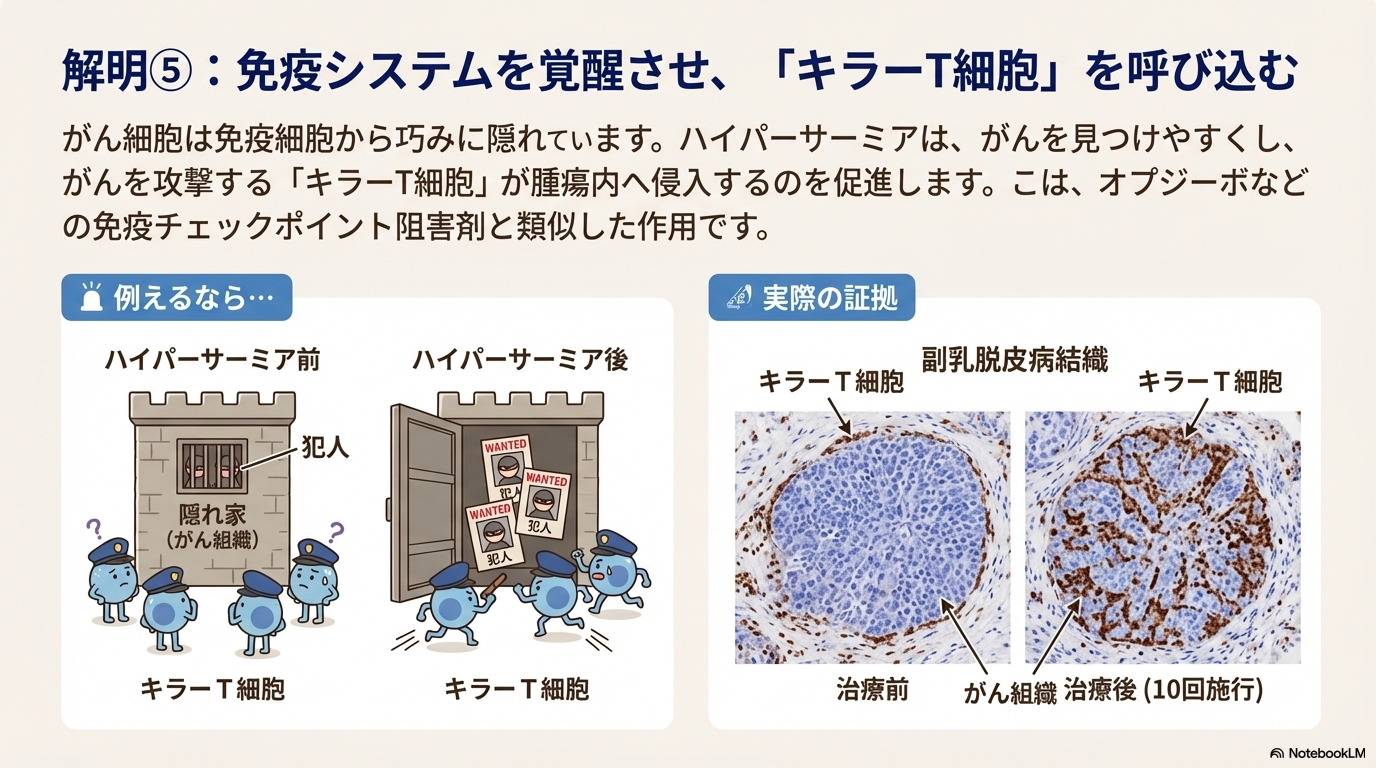 ハイパーサーミアは、免疫チェックポイント阻害剤(オプジーボなど)と同様に、患者自身の免疫システムを活性化してがんと戦わせる作用を持つ。