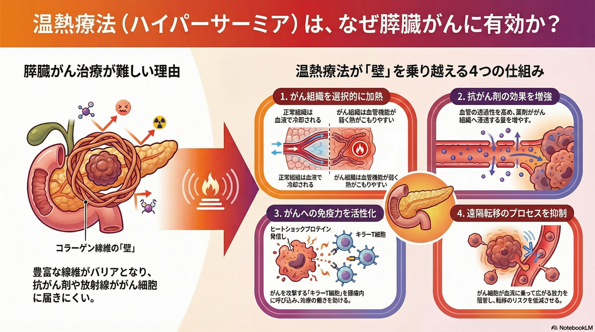 特に、膵臓がんは豊富なコラーゲン線維(間質成分)が物理的バリアとなり治療抵抗性を示すが、ハイパーサーミアは血管透過性を改善することでこのバリアの克服に寄与する。臨床試験では、切除不能膵臓がん患者において、化学療法(ゲムシタビン)にハイパーサーミアを併用することで、生存期間中央値が198日から327日へと有意に延長することが示されている。
