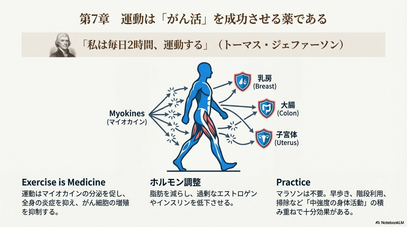 運動は単なる気晴らしではなく、全身の代謝と免疫システムを最適化する「能動的な抵抗」です。筋肉を動かすことで分泌されるマイオカイン等の物質は、炎症を抑制し、免疫細胞ががん細胞を監視・攻撃しやすい環境を作り出します。日常のささいな歩行やストレッチも、がん細胞の勝手な振る舞いを許さないための「監視体制の強化」に直結しています。