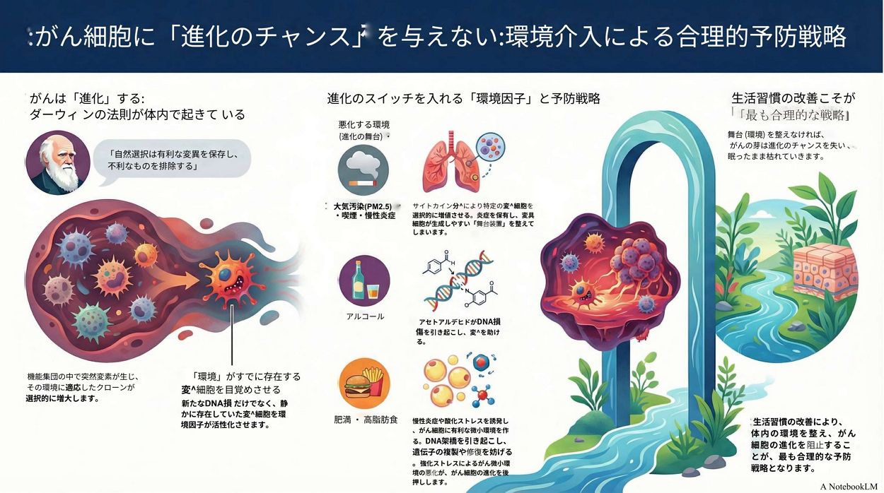 がんは単なる病気ではなく、体内で起きる「進化」の結果です。がん細胞はコピーミス(遺伝子変異)を繰り返し、過酷な治療環境にも適応して、より強力な増殖能力を獲得しようと進化し続けます。この「進化のチャンス」をいかに奪うか。これこそが、腫瘍の増大や再発を防ぐための最も合理的で科学的な戦略です。