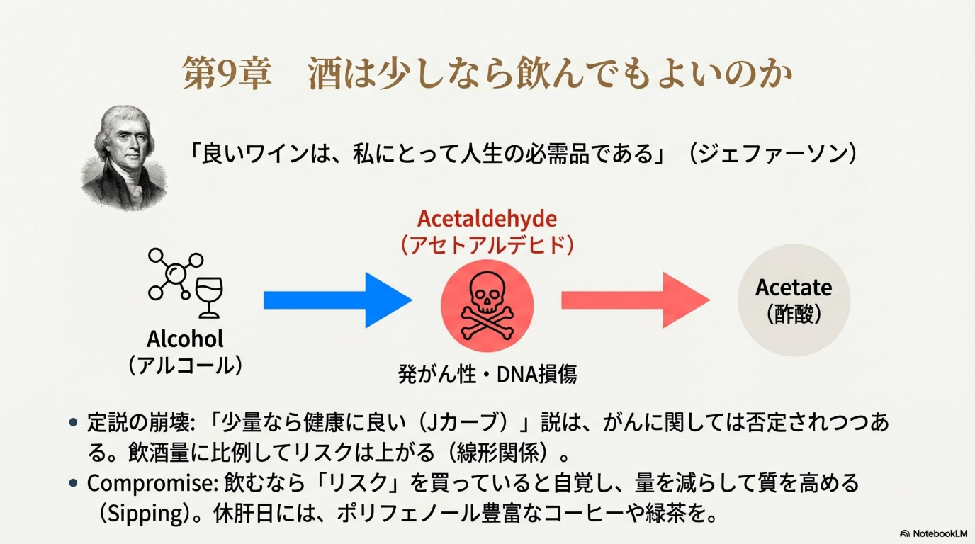 アルコールの代謝過程で生じるアセトアルデヒドは、DNAの二重らせんを異常につなぎ合わせる「DNA架橋」を引き起こし、細胞の修復機能を著しく損なわせます。これにより新たな遺伝子変異が生じやすくなり、がんがより凶暴なタイプへ進化するリスクが高まります。「節酒」は、これ以上がん細胞に有利な変異のチャンスを与えないための、物理的な防衛手段です。
