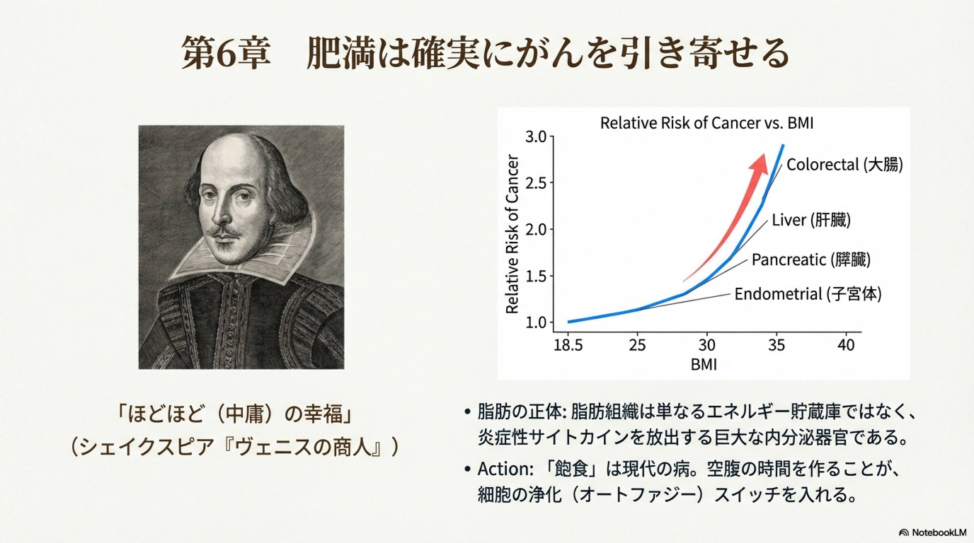 肥満は単なる見た目の問題ではなく、体内に「慢性炎症」という火種を抱え、がん細胞にインスリンという「成長の餌」を過剰に与え続ける状態を指します。インスリン抵抗性が高まると、がん細胞はより活発に増殖シグナルを受け取ってしまいます。適正な体重を管理することは、がん細胞への補給路を断ち、彼らを兵糧攻めにするための極めて合理的な生存戦略です。