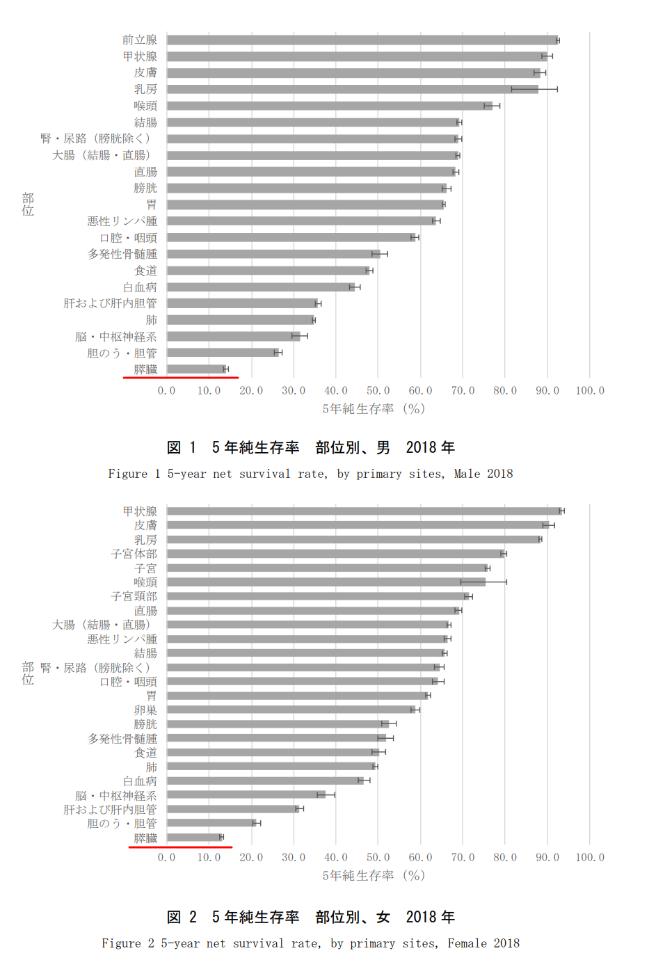 今回の報告によると、2018年に新たにがんと診断された方の5年生存率において、膵臓がんは13.5%という結果でした。