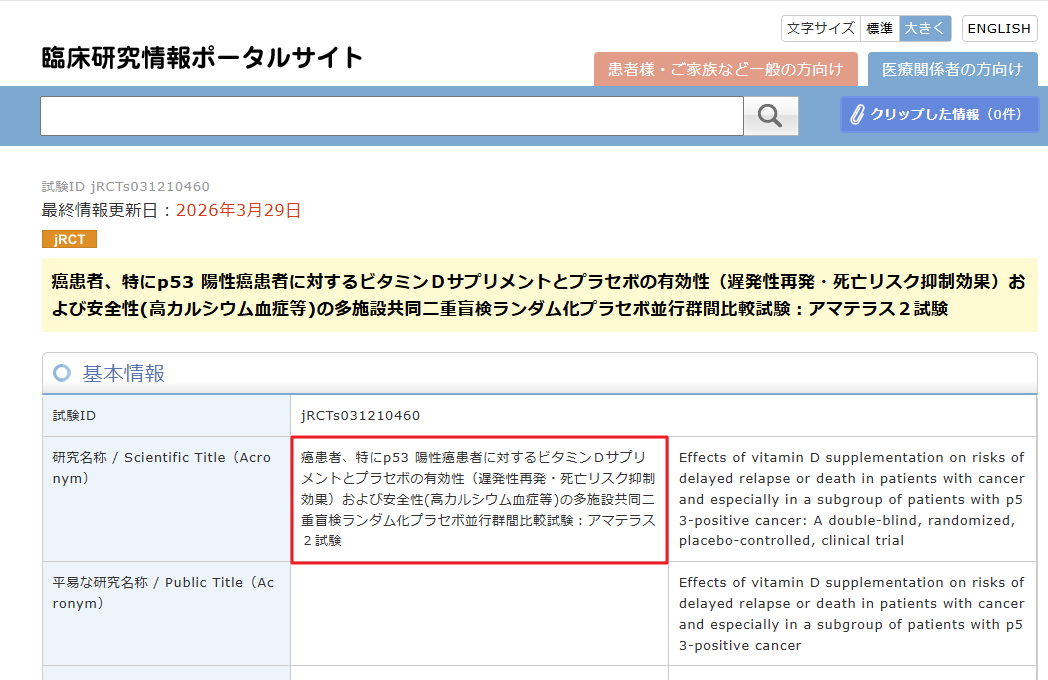 しかし今、この沈黙を破る大きな動きが始まっています。現在、膵臓がんを含む消化器がん患者を対象に、ビタミンDの再発抑制効果を検証する第III相臨床試験『アマテラス2試験(jRCTs031210460)』の参加者が募集されています。